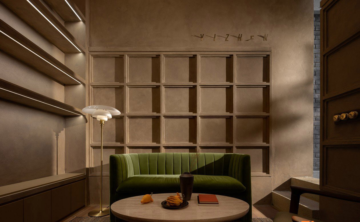 所以,室内空间的规划,是依托于消费动线与品牌认知过程而展开的构思逻辑。首先,我们用一个狭长的门廊通道将原空间分为了左右两个空间物理关系。并在这个黑色立方体的末端设置了一面做旧的铜板墙体,设置这种色彩、质感的目的,除了可以形成一个引导进入的视觉关系外,其表面悬浮的壹臻logo,也是在通过某种心理暗示告诉到访的客人,“我”的名字叫——壹臻。